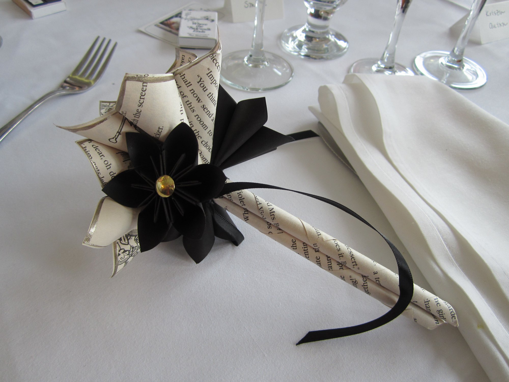 Rather than use real flowers for the bridal party bouquets, Tracy went with a more literary alternative: paper bouquets made from vintage book paper. I believe she had them specially made from a craftsman on Etsy.com I will have to find out and update this information at a later date.