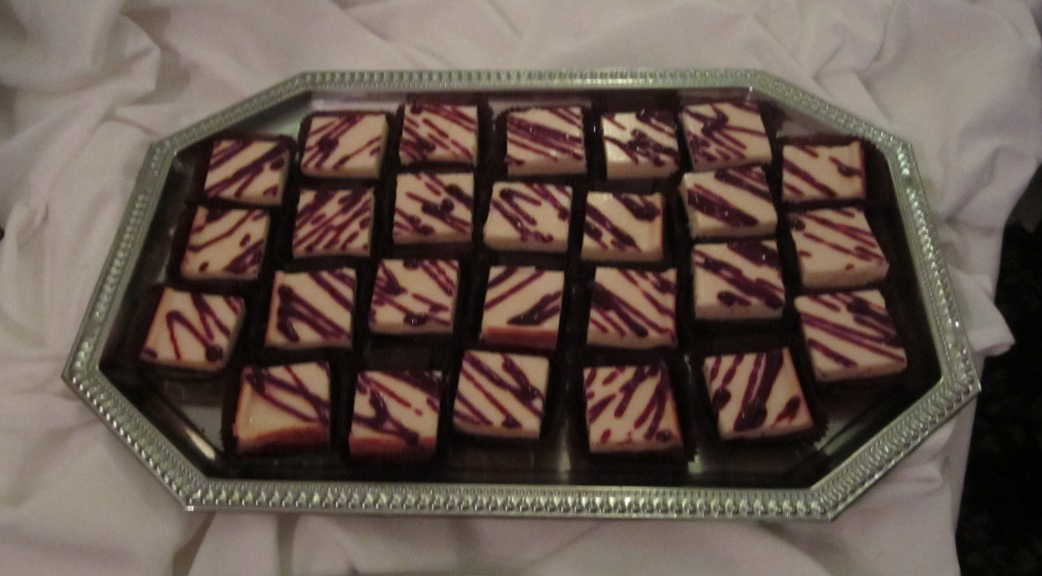 Every morsel was a taste in heavenly perfection. The filet mignon was tender and succulent. The butternut squash lasagna captivated everyone. The chicken cordon bleu melted in one’s mouth. All of the appetizers were also sinfully good. My favorites were the sliders (I think made of turkey?), Caprese skewers, and this little item to the left. Mouthwatering ahi nestled into a little won ton shell and topped with wasabi mayo. I could have eaten them all day (I consumed at least a dozen). Rather than go with the traditional wedding cake, the couple opted to go with cake pops of varying flavors. They also had chocolate covered strawberries, and these amazing mini cheesecake bites (pictured below). For more information on Dave’s Catering, and some purely intoxicating recipes, one can visit their website and blog here: http://davescatering.wordpress.com/