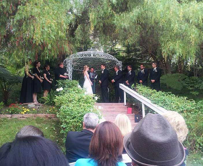In October, I attended an amazing wedding celebration of my dear friends Tracy Clifton and Michael Pierce. I was really impressed by the feng shui elements they brought to the ceremony and following reception. They chose to have their wedding at The Vineyards, an event location in the foothills of Simi Valley. Currently it is being used primary for weddings, and will be in operation as a winery in a couple of years when their grape harvests reach full maturity. The nuptials were held in the Vineyards’ lavish garden, where the five elements were in full harmonious play. A beautiful waterfall brought in flowing water energy, while healthy, nurturing trees and plants were the perfect backdrop of thriving wood. An ornate gazebo of scrolled flourishes acted as a metal canopy over the wedding party. The earth was present in the form of garden soil and the lovely walkway (pictured below). As for fire, that was evident in the sun’s rays gently landing on everyone. The ceremony was one of the best I’ve ever attended, being extremely honest and heartfelt. As well as writing their own vows, poetry was also read by various members of the wedding party. When one’s own writing, or writing they deeply connect to, is introduced into a ceremony, it adds a beneficial wood element to the ritual. Wood is the creative element that feeds fire, thus these personal words are feeding the fire here of love and passion. The union was officiated by Tracy’s cousin, Tom McElroy, a Christian Science Practitioner. The wedding party and a couple of guest can be seen in the photo above (that’s me in the brown hat).