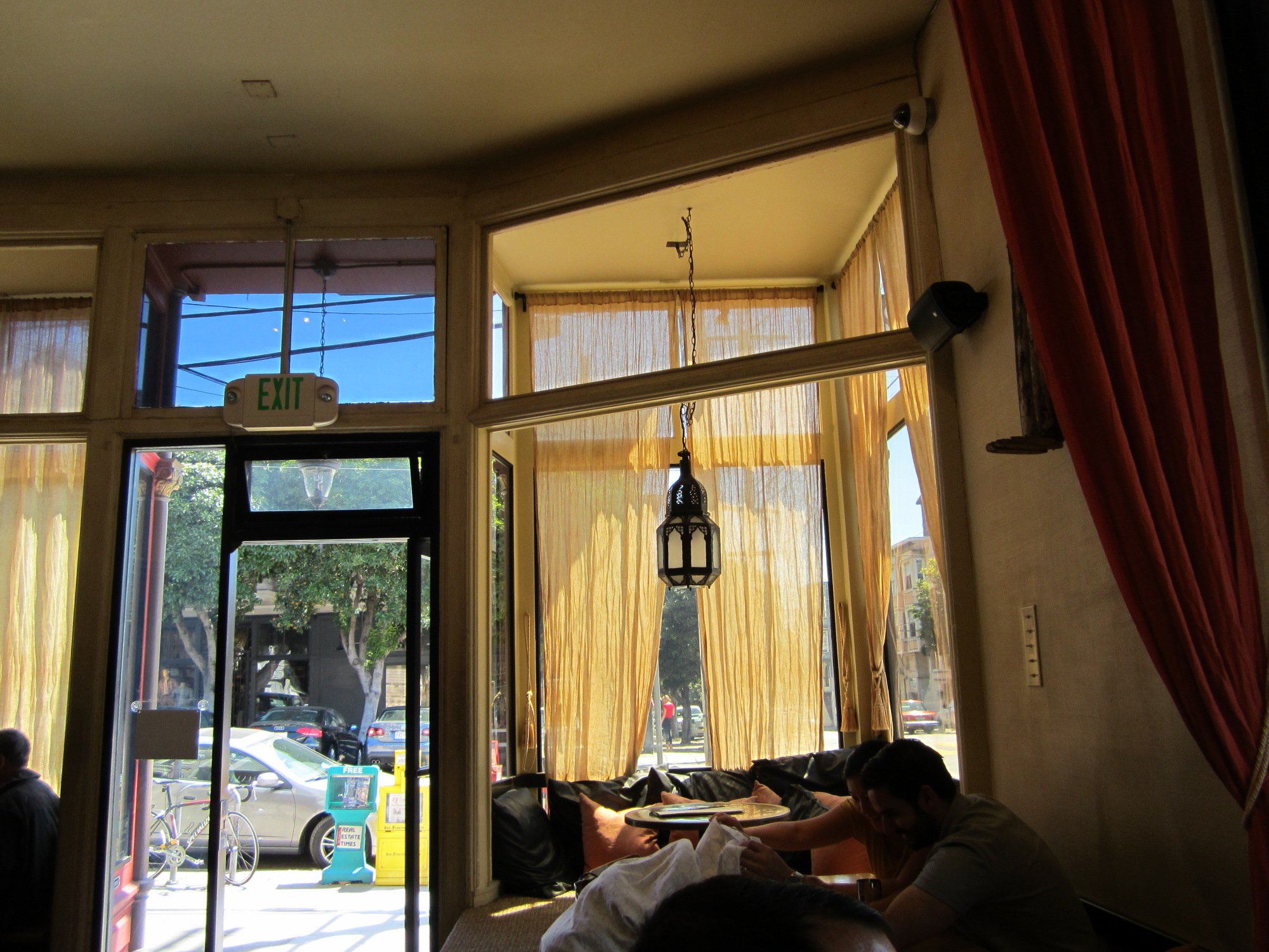 Billowy curtains shield patrons from the sun’s rays, and help to foster a more intimate atmosphere between seating arrangements. I also love the lantern in the window, and the high ceilings that allow chi to move freely throughout the space.